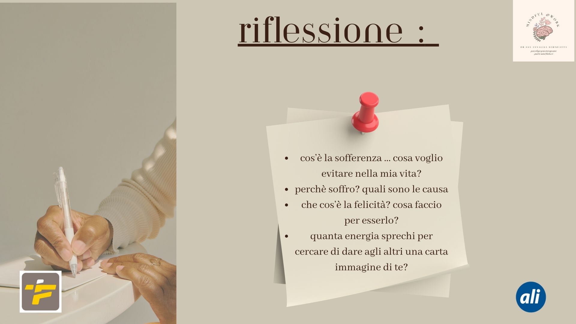 In questo secondo incontro abbiamo indagato la differenza tra sofferenza e dolore, sperimentando la meditazione della doppia freccia. Abbia riflettuto sul tema del pilota automatico e di come poter usare il triangolo della consapevolezza per uscirne. Infine abbiamo sperimentato piccole strategie di grounding, per ritrovare centratura e calma nei momenti di stress.