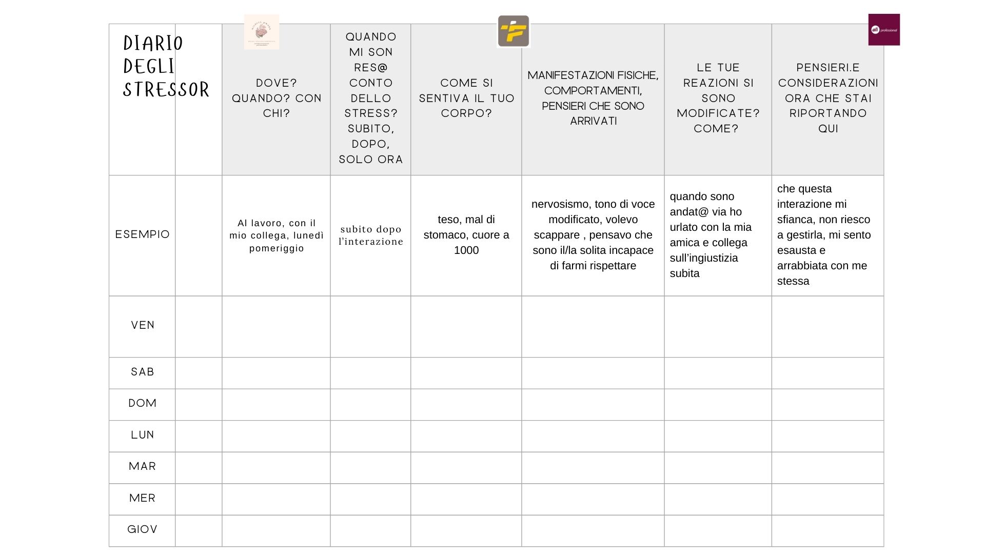 Infine abbiamo inserito un diario degli stressor, per diventare più consapevoli di ciò che nelle nostre giornate ci porta tensione.