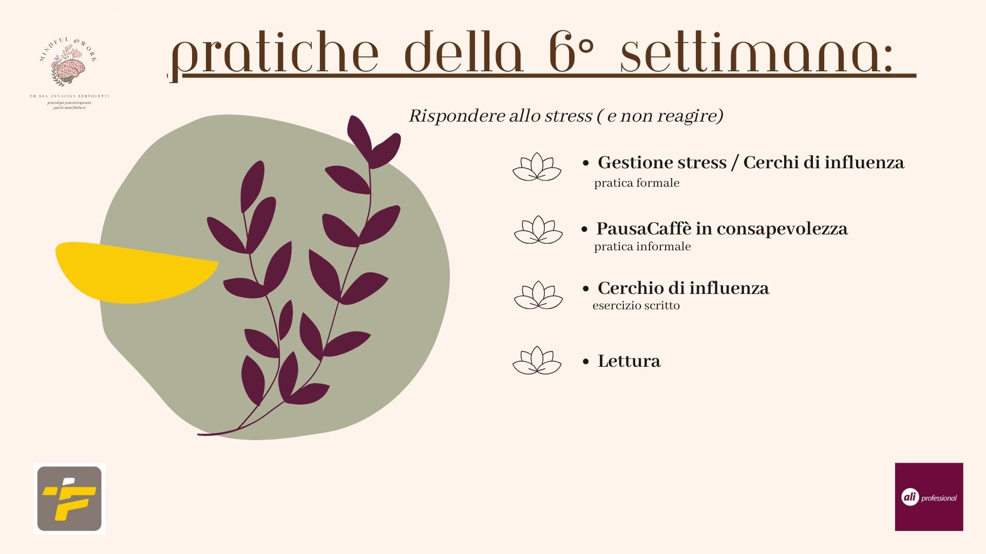 In questo incontro abbiamo osservato la differenza tra reagire e rispondere allo stress. Siamo partiti dal circolo della consapevolezza, osservando i cerchi di influenza; con meditazioni su tali temi.