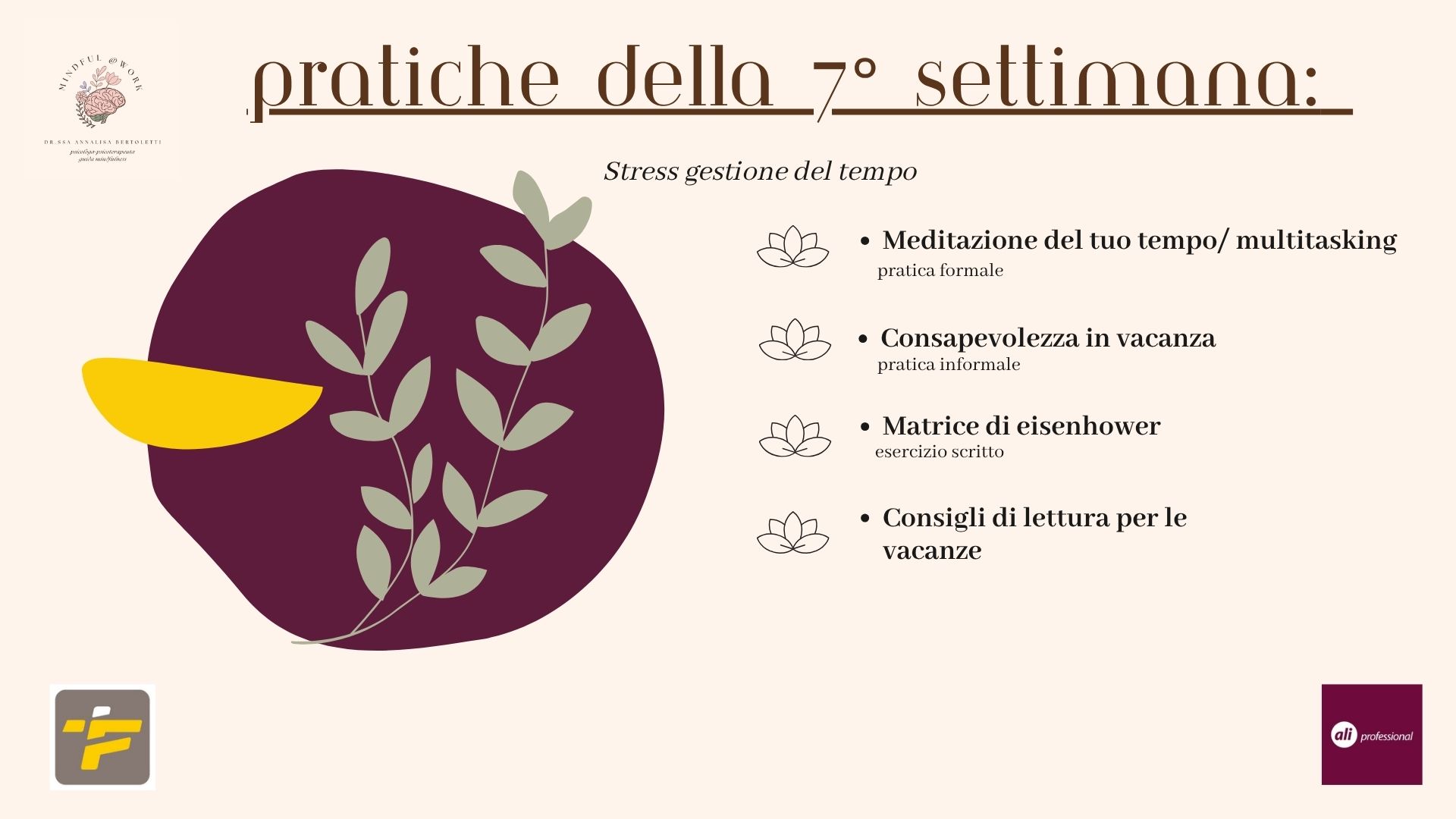 Nel settimo incontro abbiamo iniziato a vedere i diversi fattori di sterss, partendo dallo stress del tempo. L'inganno del multitasking.