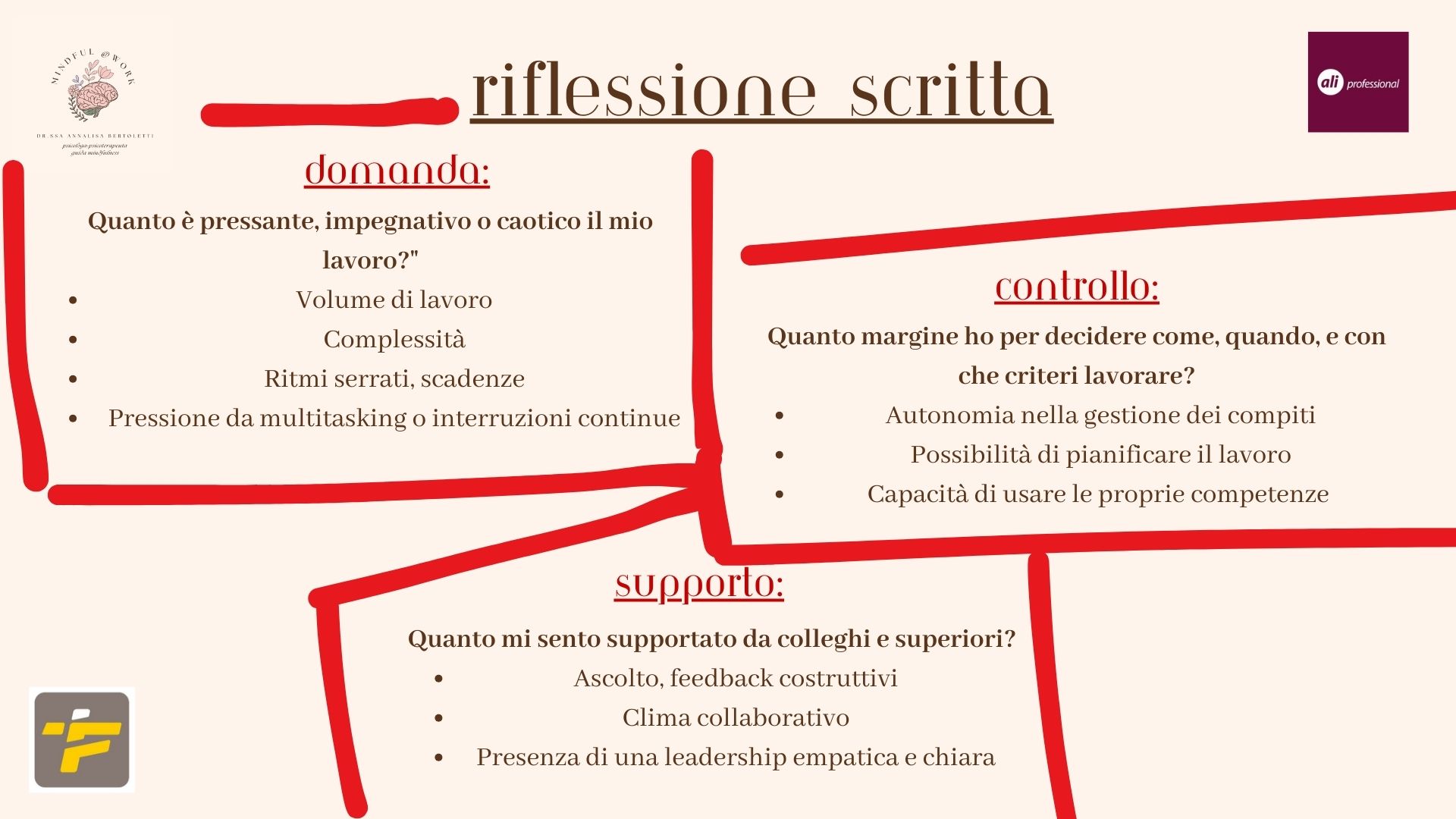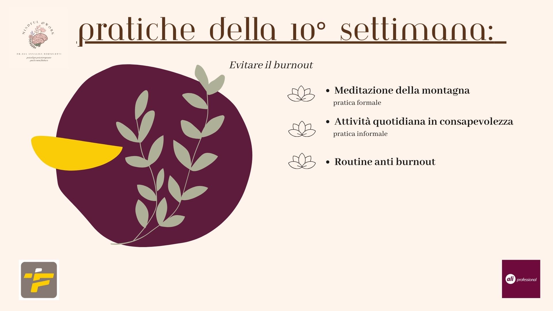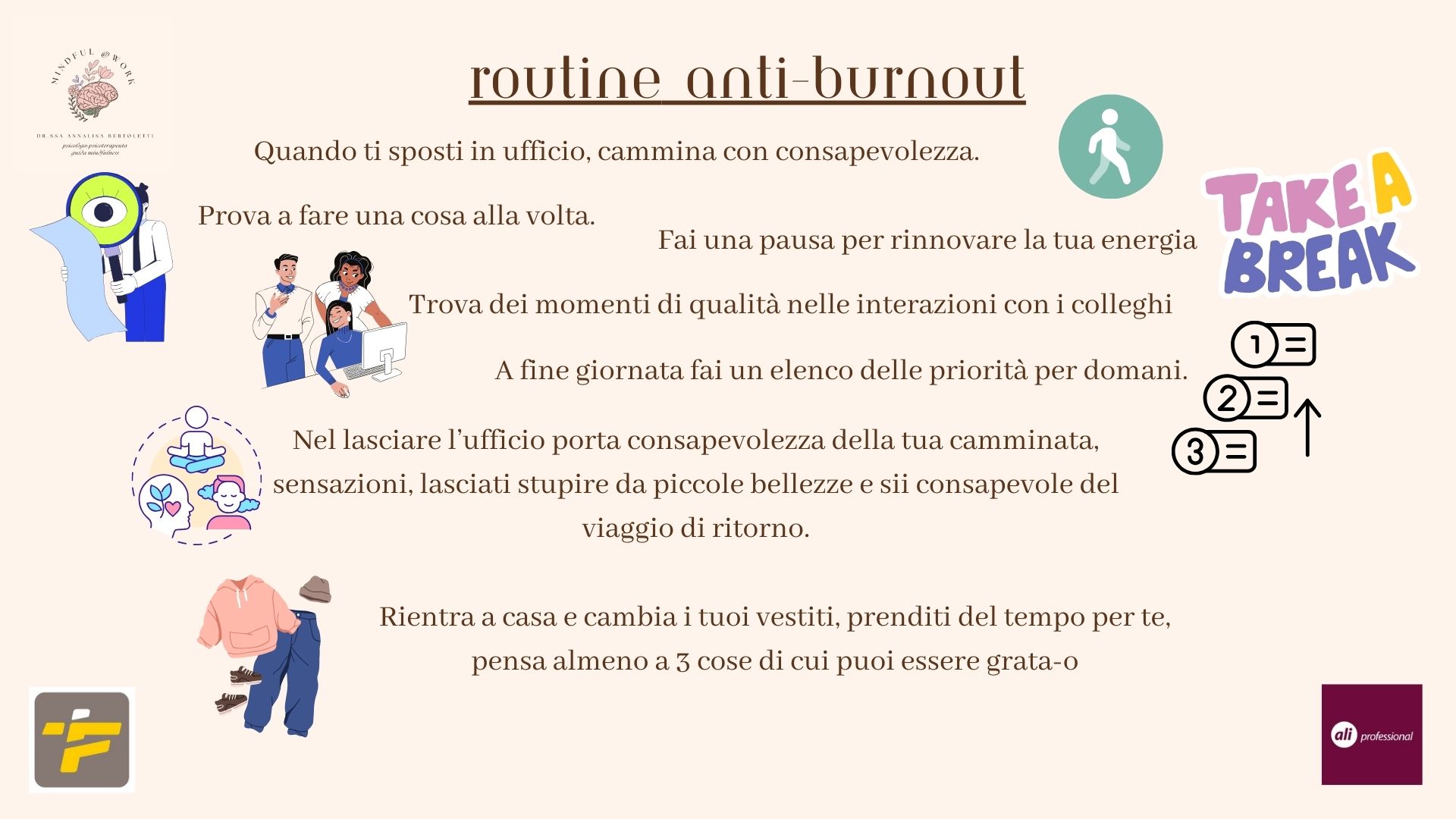 Proseguiamo in questa settimana nell'analizzare lo stress lavoro correlato e l'evoluzione ad uno stato di burnout. Abbiamo osservato i sintomi, i fattori di rischio, meditato sul nostro sentire a riguardo e quali piccoli gesti possiamo inserire nelle nostre routine per prenderci cura.