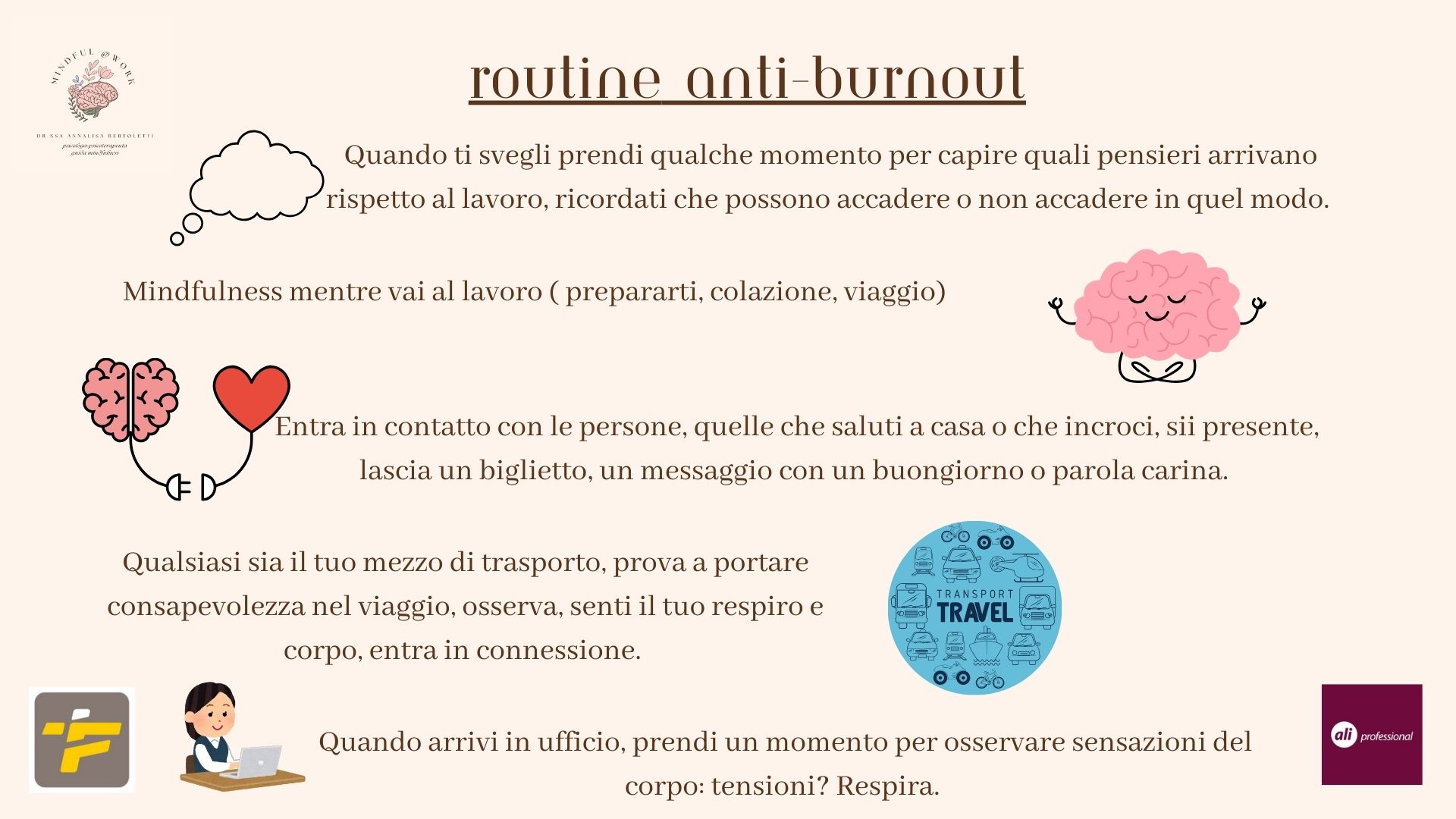 Mindful@Work è pensato proprio per supportare i dipendenti nel migliorare la propria gestione dello stress e del tempo, potenziando allo stesso tempo le relazioni interpersonali e il senso di auto efficacia. Attraverso pratiche come brevi meditazioni, esercizi di respirazione e la comprensione dei meccanismi del cervello e delle emozioni, i partecipanti imparano a navigare le complessità della vita lavorativa con maggiore serenità e consapevolezza.