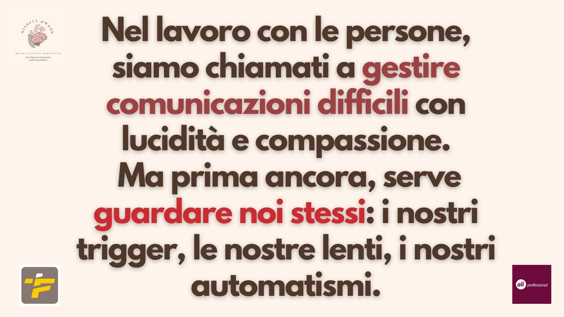 In questo incontro abbiamo iniziato ad osservare lo stress che deriva dalla comunicazione e relaizione con gli altri. Siamo partiti ad osservare la lente che usiamo, quale sia il nostro stile comunicativo, come ci relazioniamo con noi stessi nei momenti di stress e fatica, per indagare come poi portiamo noi stessi con gli altri.